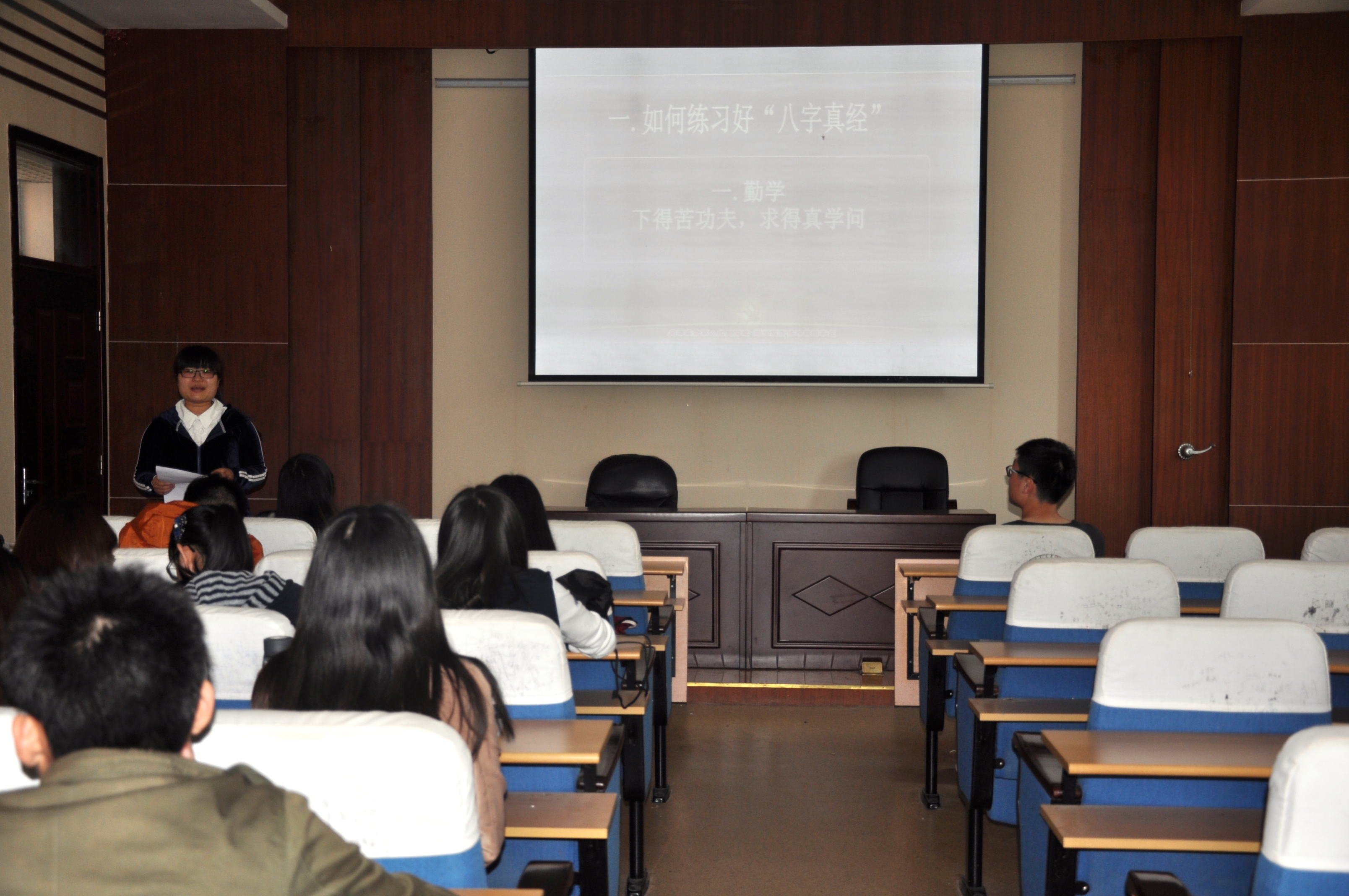 本次学习研讨会分为:如何练习好“八字真经”、学习习近平总书记讲话精神“四进四信”和专家报告学习及解读三个部分。首先,刘露向在座的同学们讲解了如何练好“八字真经”。她以习近平总书记在北大与师生座谈时强调的“扣子理论”为例说明了抓好青年这一时期的价值观养成的重要性。她分别阐明了“八字真经”——勤学、修德、明辨和笃实的深刻内涵,并倡导广大青年从现在做起,从自己做起,勤学、修德、明辨、笃实,使社会主义核心价值观成为自己的基本遵循,身体力行,努力在实现中国梦的伟大实践中创造自己的精彩人生。随后,闫娜向在座同学传达了习近平总书记提出的 “四进四信”的深刻内涵。她呼吁大家主动参与到书写“中国梦”的队伍中,并表达了早日实现“中国梦”的美好祝愿。最后,周琛带领在座同学作专家报告的学习及解读。他解读了中国人民大学王向明所作的“以‘四个全面’战略布局统领中国进步发展”的报告、林泰所作的“坚持中国道路 引领社会思潮”的报告以及王民忠所作的“高校学生思想教育的价值及其体现”的报告。其中包括反腐倡廉、环境污染、思想教育等众多当今社会的热点问题。
