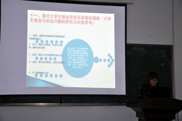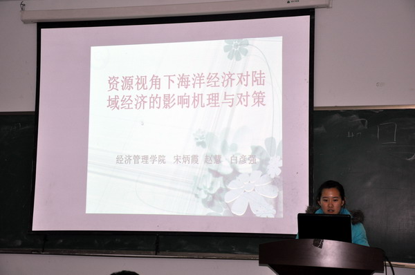 参加答辩会的项目是从学校和学院立项中经过初次答辩筛选出的十个立项,分别进行PPT答辩演示。科研立项的研究课题自选,此次展示的立项基本上是与经济类相关的一些案例的研究和分析。同学们都做了认真准备,包括对研究背景的探索,对研究目的和思路的认识,对调查问卷的精心设计,最后做出分析和结论。其中有对大学生就业状况的分析及法律保障问题的研究,有对山东半岛地区海洋经济发展对陆域经济发展的影响机理与对策,还有对高校学术类社团发展的探究。