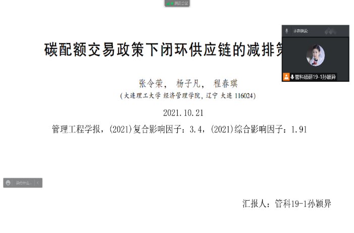 第二场:孙颖异同学以张令荣、杨子凡2021年发表在《管理工程学报》(基金委A类期刊)上的文章《碳配额交易政策下闭环供应链的减排策略研究》进行了讲解。从该论文的研究背景、研究思路、研究内容以及相关结论展开分析,详细阐述了碳配额交易政策下制造商减排投资、回收再制造、同时进行减排投资与回收再制造的三种博弈模式。汇报完毕后,与张强等博士同学对论文的创新性、扩展研究和参数设置等问题展开了讨论,例如张强博士提出的影响变量关系的阈值设置问题和博弈模型未来的发展方向,宋文轩博士提出的博弈仿真阶段参数的设置问题,以及博弈模型与现实的契合性。