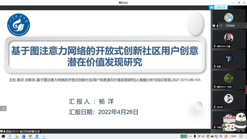 第一场:杨洋同学对其在《数据分析与知识发现》上发表的《基于图注意力网络的开放式创新社区用户创意潜在价值发现研究》文章进行了讲解。讲解的内容主要包括该论文的研究背景、研究思路,研究综述、研究过程以及结论与展望。论文主要是为解决开放式创新社区中因信息过载导致用户创意价值未能及时发现的问题,提高社区创新资源的利用效果,设计了用户创意的双重网络结构,构建了基于图注意力网络的用户创意潜在价值发现模型。应用典型开放式创新社区数据进行实证研究,结果表明模型的准确率为90.49%,为社区针对性引导用户参与,充分挖掘社区创新资源提供技术支持。汇报完毕后,与张强、宋文轩博士就特征取值、模型选择等问题展开详细讨论。