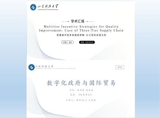 第二场:肖怡君同学以《数字化政府与国际贸易》为例,深入讲解了数字化政府对国际贸易的影响方向与影响机制。论文利用2003-2016年168个经济体面板数据,通过构造引力模型,实证分析了进出口方政府数字化对双边贸易规模的影响;并通过构建交互项分析了数字化政府对发展程度不同的经济体的差异性影响,探讨了信息不对称渠道和通关便利化渠道;最后进一步讨论了双边电子政务发展指数对中国出口和进口贸易的影响。研究发现:进出口双方数字化政府对双边贸易产生了显著的正向作用;收入水平越高的国家正向作用越大,主要是由各国配套措施、微观主体效率、贸易结构差异所致;从渠道看,数字化政府主要通过减少信息不对称、促进通关便利化促进国际贸易,并且减少信息不对称渠道作用更明显;对于中国而言,数字化政府促进了出口贸易,但对进口贸易的影响并不显著。中国应加快推进自身数字化政府建设,改善相关互补性条件,从而更好利用国际数字化政府平台提供的贸易便利和丰富信息推动对外贸易高质量发展。汇报完毕后,李浩然等同学对数据来源、数据设置可靠性等问题展开了讨论。