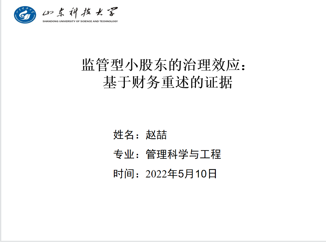 第二场:赵喆同学对2021年何慧华和方军雄发表在《管理世界》(基金委A类期刊)上的文章《监管型小股东的治理效应:基于财务重述的证据》进行了讲解。论文采用 DID 的设计,基于大样本考察了投服中心的设立对公司财务重述的治理效应,为投服中心产生的实际运作效果提供初步的实证证据。同时考虑外部治理环境即审计质量、机构投资者持股比例、分析师跟踪人数的调节作用,并且进一步研究投服中心影响财务重述的实现机理。汇报完毕后,刘军博士提出了如何量化投服中心的威慑效应的问题,赵喆同学就此进行了回答。