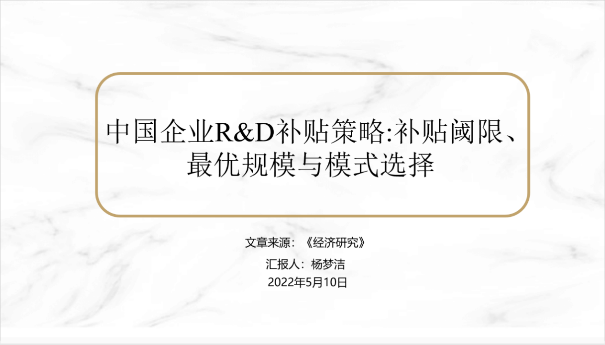 第一场:杨梦洁同学选取安同良、千慧雄2021年发表在《经济研究》上的文章《中国企业R&D补贴策略:补贴阈限、最优规模与模式选择》进行了讲解。讲解的内容包括R&D补贴对企业技术创新行为的影响机制模型与实证检验分析等。该论文从技术外溢视角出发,将R&D补贴嵌入到R&D竞争框架内,构建理论模型系统阐释R&D补贴的相关问题,并运用产业层面数据进行实证分析。研究发现:给定技术溢出水平,只有当其他经济条件处在补贴阈限内时才需要R&D补贴;当需要补贴时,存在一个最优的R&D补贴规模;R&D补贴绩效会随着经济条件的变化发生反转;“普惠式”补贴与“竞争式”补贴有各自的优势区间。中国的R&D补贴总体有效,高技术产业的补贴绩效尤为显著;税收优惠政策对企业R&D投资的带动作用要优于直接的财政补贴。