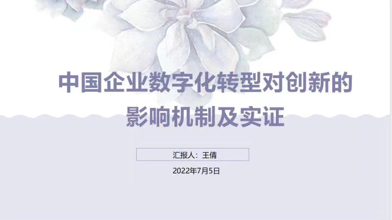 第一场:王倩同学以安同良、闻锐2022年发表在《现代经济探讨》上的文章《中国企业数字化转型对创新的影响机制及实证》为例,系统性地梳理现有数字化转型水平的测度方法,并详细剖析了数字化转型影响企业创新的具体机制,指出数字化转型通过实现开放式网络化创新、引致组织管理创新以及提高企业人力资本水平等机制促进企业创新,全面的数字化转型比仅仅应用数字技术能更有效地促进创新。最后总结了文章的主要观点与结论,针对企业数字化转型契机下如何更好发挥政府作用与参会同学展开讨论。