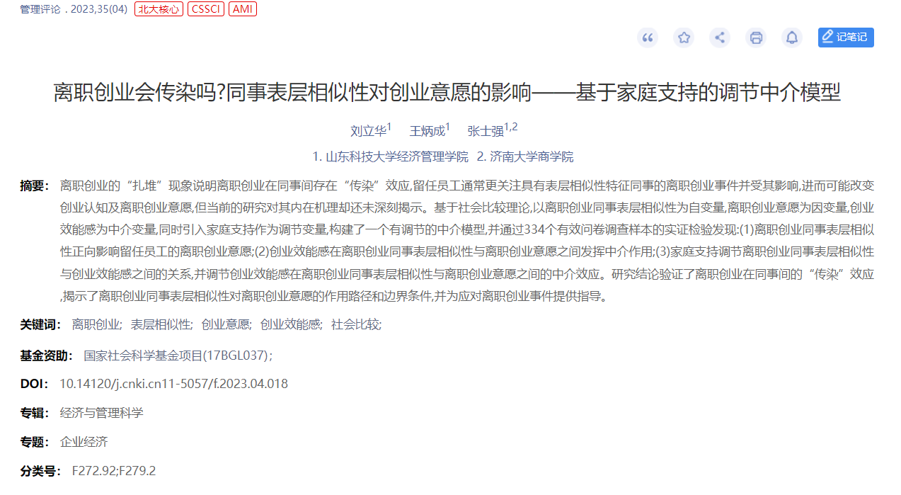 我院博士生刘立华(导师:王炳成教授)的论文“离职创业会传染吗?同事表层相似性对创业意愿的影响——基于家庭支持的调节中介模型”在管理领域中文期刊《管理评论》(CSSCI,IF=6.17)发表。