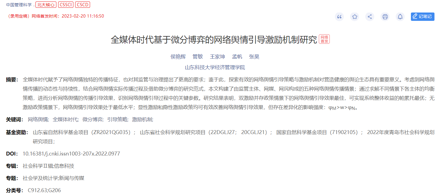 我院硕士生管敏(导师:侯艳辉副教授)的论文“全媒体时代基于微分博弈的网络舆情引导激励机制研究”在管理学领域中文期刊《中国管理科学》(CSSCI,IF=5.5)发表。