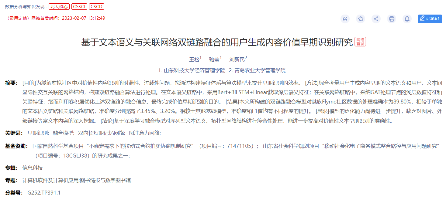 我院硕士生骆莹(导师:王松副教授)的论文“基于文本语义与关联网络双链路融合的用户生成内容价值早期识别研究”在中文期刊《数据分析与知识发现》(CSSCI,IF=3.3)发表。