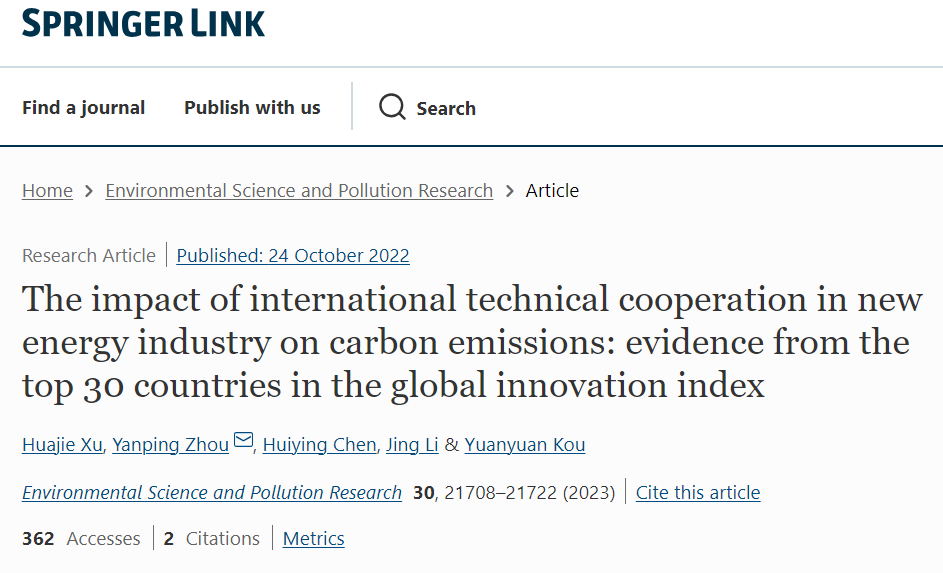 我院硕士生徐华杰(导师:周衍平教授)的论文“The impact of international technical cooperation in new energy industry on carbon emissions: evidence from the top 30 countries in the global innovation index”在环境与管理领域国际期刊《Environmental Science And Pollution Research》(SCI,IF=5.8,中科院JCR三区)发表。