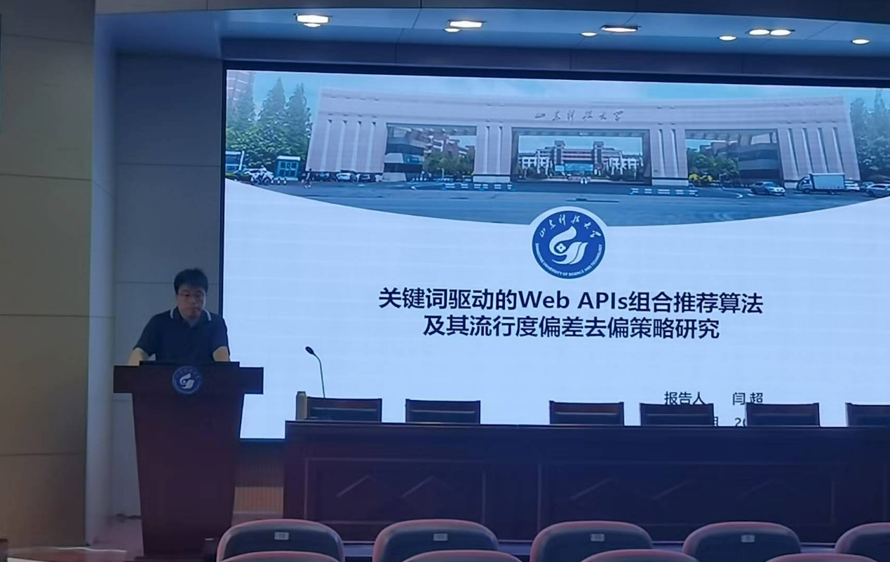 2020级管理科学与工程专业博士研究生闫超作了题为“关键词驱动的Web APIs组合推荐算法及其流行度偏差去偏策略研究”的学术报告,报告围绕他的博士毕业论文展开。报告中,闫超首先针对Web APIs组合推荐的概念以及当前存在的问题进行了分析,并探讨了API关联表示模型的定义方法以及基于该模型的Web APIs组合推荐算法的实现机理;然后他又分析了Web APIs组合推荐算法中的流行度偏差问题,并详细介绍了其提出的面向Web APIs组合推荐的流行度偏差去偏算法;最后他又进一步分析了影响去偏算法性能的各个要素。