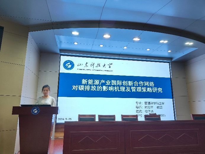2021级管理科学与工程专业博士研究生徐华杰作了题为“新能源产业国际创新合作网络对碳排放的影响机理及管理策略研究”的学术报告。徐华杰指出当前气候变暖等环境问题严重威胁着社会发展和人类生存,大力发展新能源产业,开发和使用新能源,已经成为各国应对环境问题的战略选择。并且新能源产业国际创新合作极大地显示出降低碳排放目标的潜力。基于此,她以全球创新指数排名前30位的国家为研究对象,运用社会网络分析法构建新能源产业国际创新合作网络。进一步考虑创新主体的技术吸收能力和技术扩散意愿,改进SIR模型,构建了绿色技术扩散模型揭示新能源产业国际创新合作网络对碳排放的作用机理。分别运用通过固定效应模型、面板门槛模型和空间杜宾模型检验新能源产业国际创新合作网络节点的中心性对碳排放强度的线性影响、非线性影响和空间溢出影响效应。进而探索新能源产业国际创新合作策略。