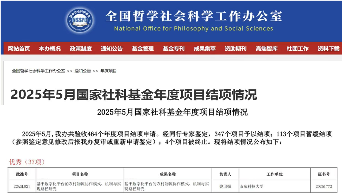 近日,全国哲学社会科学工作办公室公布了2025年5月国家社会科学基金年度项目结项情况,我院饶卫振教授主持的重点项目“基于数字化平台的农村物流协作模式、机制与实现路径研究”(项目批准号:22AGL021)成功结题,获评“优秀”等级。全国哲学社会科学工作办公室本次共验收464个年度项目结项申请,经同行专家鉴定,获评优秀等级项目37个,优秀率7.98%。