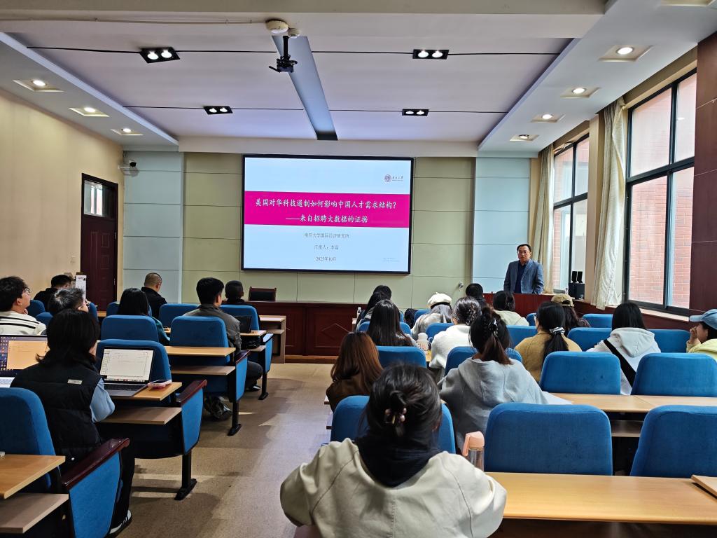 10月20日,必赢776net在教学楼317会议室举办经管大讲堂活动,特邀南开大学经济学院国际经济研究所副所长、博士生导师李磊教授担任主讲嘉宾,围绕“美国对华科技遏制如何影响中国人才需求结构”为学院师生作学术报告。学院教师,博士、硕士研究生积极参加,讲座由学院副院长饶卫振主持。