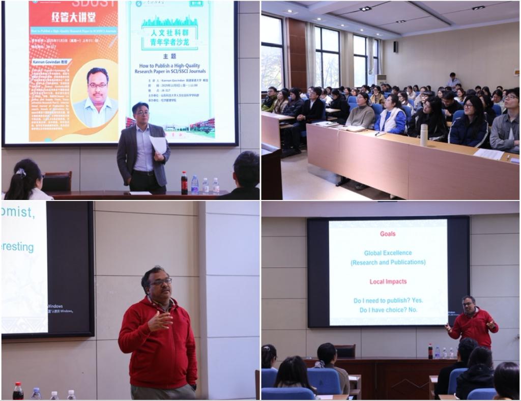11月3日,必赢776net在教学楼317会议室成功举办“经管大讲堂”活动。本次活动特邀澳大利亚阿德莱德大学可持续性、能源与资源研究所讲席教授Kannan Govindan担任主讲嘉宾,以“如何在SCI/SSCI期刊上发表高质量研究论文”为题,为学院师生带来一场内容丰富的学术报告。讲座由必赢776net副院长饶卫振主持。学院党委书记庄兴华、泰山学者青年专家刘露、泰山学者青年专家韩帅以及学院部分教师和研究生共同参加了本次活动。