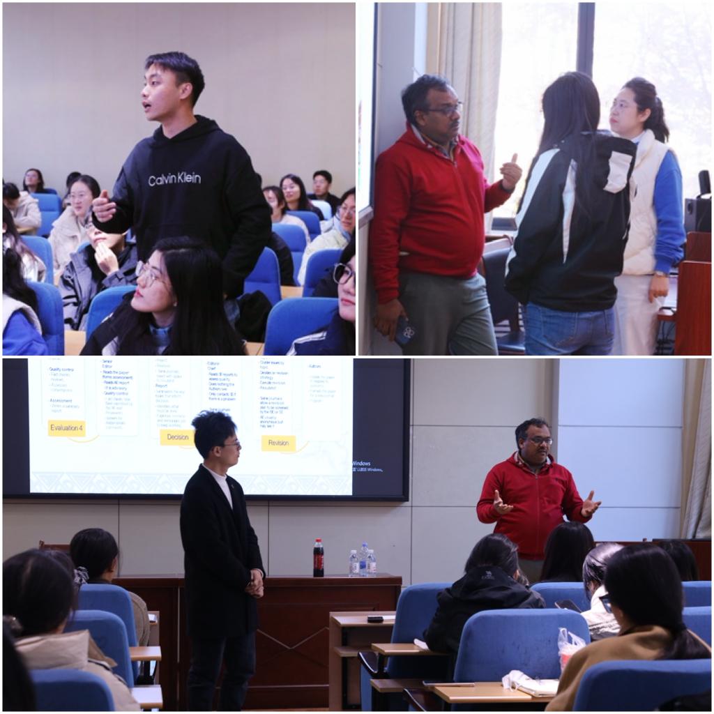 饶卫振在开场致辞中详细介绍了Kannan Govindan教授的研究背景与学术成果,并代表学院对其到来表示欢迎。报告中,Kannan Govindan教授结合自身多年的学术研究与期刊编审经验,围绕高质量学术论文的选题构思、创新提炼、结构设计、期刊选择、投稿策略及审稿回应等关键环节,系统分享了在SCI/SSCI期刊成功发表高水平研究成果的实用技巧与宝贵经验。Govindan教授还结合其研究方向的前沿进展,探讨了如何将学术研究与全球可持续发展议题有机融合,以进一步提升研究的学术影响力与社会价值。