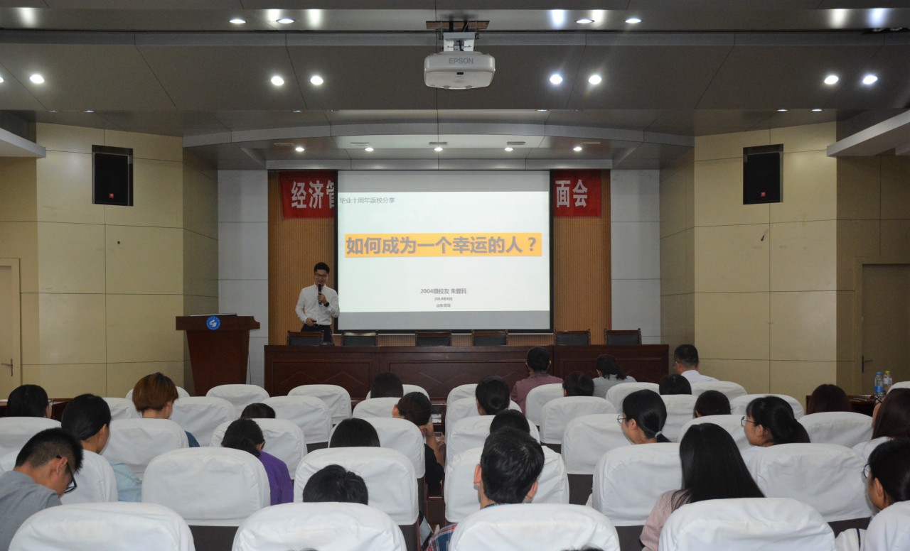 会上,朱登科、乔永贺和高军分别由自身经历出发,讲述考研、求职、就业等注意事项,分享成功经验。朱登科的演讲题目为《如何成为一个幸运的人》,他简要讲述了自己从大学到硕士生的经历,并强调无论是考研还是就业,努力、善良与坚持才是幸运密码。研究生就读于中国对外经济贸易大学的乔永贺则强调了制定计划与养成良好心态的重要性,他认为复习知识要系统化、整体化。高军着重讲述了他从工作中所总结出来的经验。他认为一个大学生首先要明确自己想要什么,这样在工作中才能主动针对性地去寻找市场,通过细分自己的市场,发现潜在的客户。最后,他们表达了对学弟学妹们美好的祝福。经验交流会上气氛热烈,掌声不断。