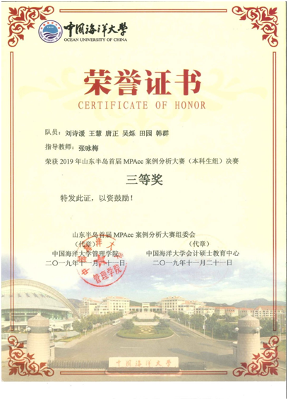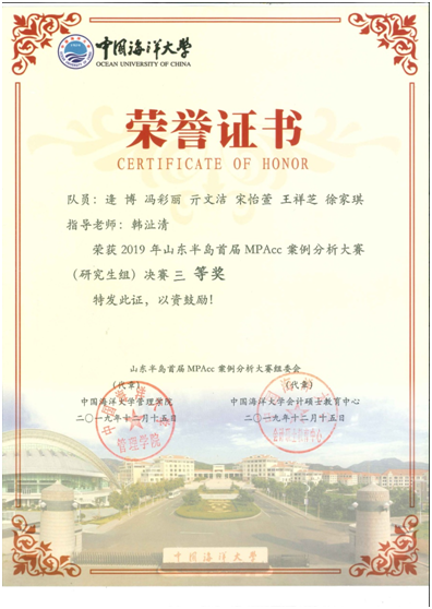 2019年12月15日,历时一个半月的山东半岛首届MPAcc案例分析大赛圆满结束。本次大赛由中国海洋大学、山东大学(威海)、哈尔滨工业大学(威海)、中国石油大学(华东)、青岛大学、山东科技大学、青岛科技大学、青岛理工大学、山东工商学院主办,中国海洋大学承办,参赛队伍分为本科生组及研究生组。