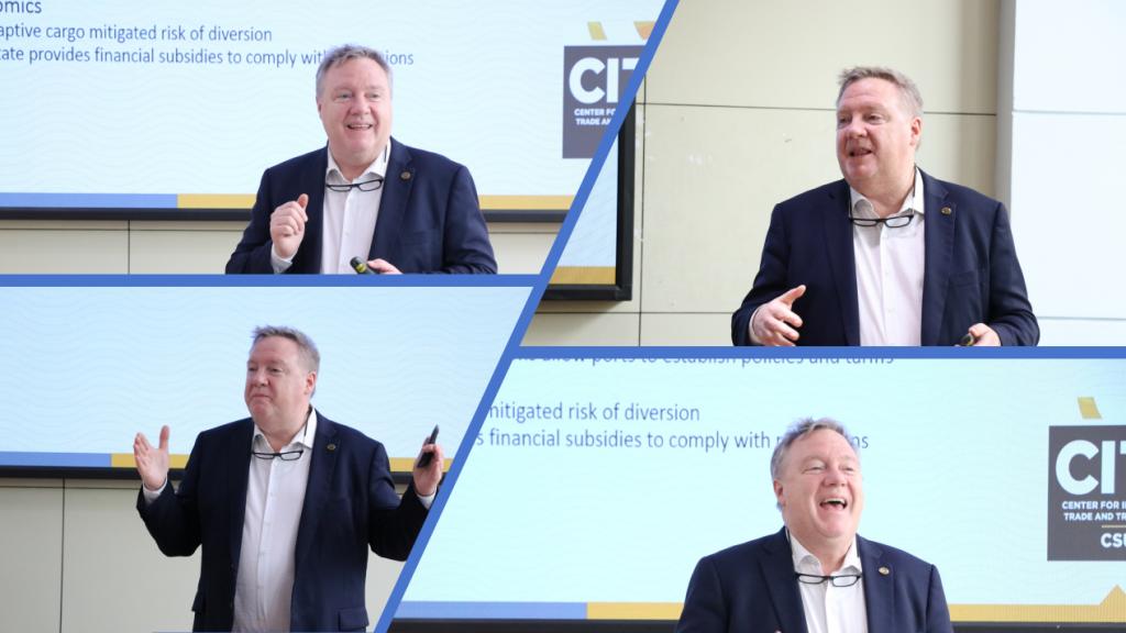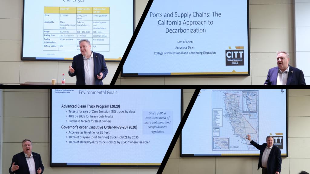 接下来,欧布莱恩教授介绍了长滩市及加州大学长滩分校的地理位置和教育资源,特别提到国际贸易与运输中心如何连接并赋能贸易与运输行业的劳动力,强调了加州大学长滩分校在全球教育交流中的积极作用;然后详细讲解了加州的环境规制历史与港口治理结构,介绍了洛杉矶/长滩港口复合体的经济数据和环境政策及港口对地区经济的重要贡献及其在环境保护中的先行措施,如低碳燃料标准和零排放车辆的推广;最后讲解了政府的环境目标与港口的响应举措,包括优化货物运输方式和增强港口设施的环境效率等。