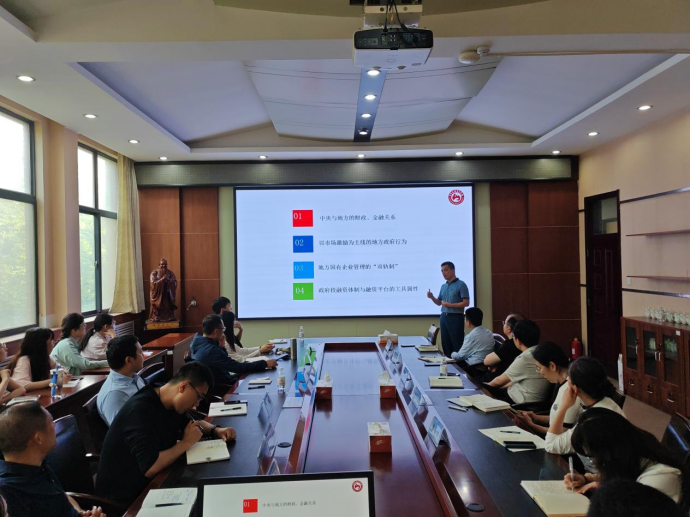 活动中,徐军伟以“地方融资平台市场化转型:统筹发展与安全”为主题,从“融资平台:经济发展阶级产物”、“融资平台的制度与约束”、“把握微观机制”、“转型策略”四部分进行讲解。他详细阐释了融资平台的定义,讲述了地方政府举债变迁和融资平台公司的制度变迁,分析了变迁过程的关键节点和关键政策文件。对融资平台持续举债的微观机制、风险联保表现等问题进行了阐述,提出并介绍了平台分类、分步、分形的转型策略。随后,徐军伟与师生们围绕投融资、大国金融博弈和地方融资平台市场化转型相关问题进行了深入讨论交流。