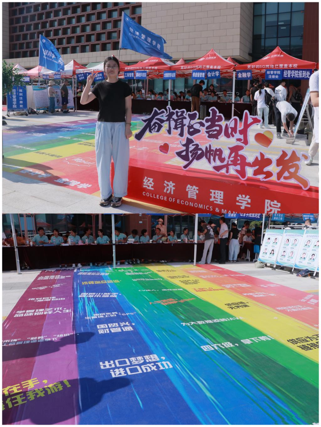 “抢pu!、高数再爱我一次、高数不能挂、英语不能差....”学院迎新报到点的“彩虹跑道”,吸引了众多新生打卡。“彩虹跑道”上有不同专业、不同年级的迎新标语,寓意新生踏上“彩虹跑道”,开启美丽多彩的大学生活,书写璀璨的人生篇章。