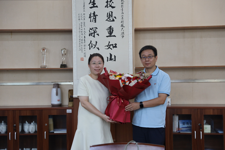 陈绍杰与郝敏老师进行了亲切交流,细致了解一线教学工作的具体情况,围绕教学与科研的差异、课堂质量评价标准等话题展开深入讨论,并对郝敏老师在岗位上兢兢业业、育人不倦的突出表现予以充分肯定。陈绍杰指出,教学是一项需要深厚积淀和长期投入的工作,成果往往呈现周期长、显效慢,尤其需要广大教师坚守初心、耐得住寂寞、沉得下心来,以深厚的专业素养和温暖的育人情怀践行教育使命。郝敏老师对学校的关怀与支持表达感谢,她表示,自己始终坚持因材施教、用心陪伴,在三尺讲台上尽己所能传递知识与温度,未来也将继续扎根教学一线,努力培养更多优秀人才。庄兴华就学院近年来在教学竞赛、专业建设等方面取得的奖项与成果作了简要汇报,代表学院对学校领导的关心表示感谢。