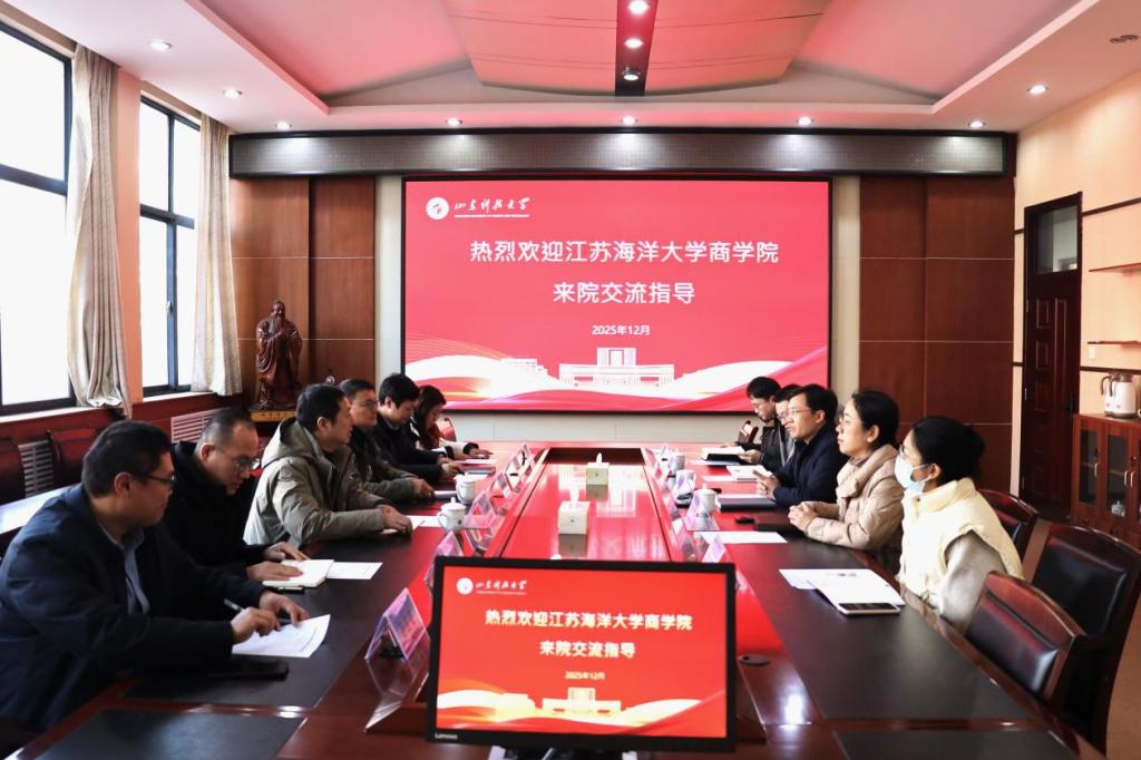 庄兴华对江苏海洋大学商学院一行的到访表示欢迎,并系统介绍了学院在党建工作、学科建设、人才培养、对外交流等方面的发展情况与取得的成效,希望以此次交流为契机,进一步增进双方了解,拓展合作空间。万金店、王志金介绍了江苏海洋大学商学院的办学优势、学科特色、发展定位等发展近况,并期待双方加强交流、互学互鉴,协同共进。交流研讨环节,双方围绕人才引育、科研平台建设、留学生培养等主题展开讨论,分享经验。