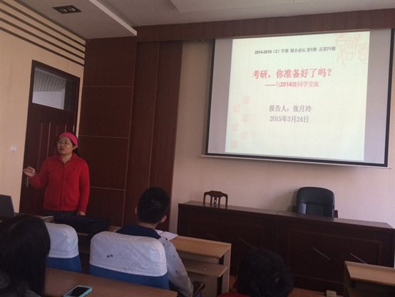 张月玲教授指出,本次论坛的核心是鼓励激发同学们的考研热情。源于她参加研究生推免、面试、考研状况及身边事例等的思考。她从考研的动机、学习目标、考研的准备及出国留学申请等几方面,向在座的同学们一一讲叙。
