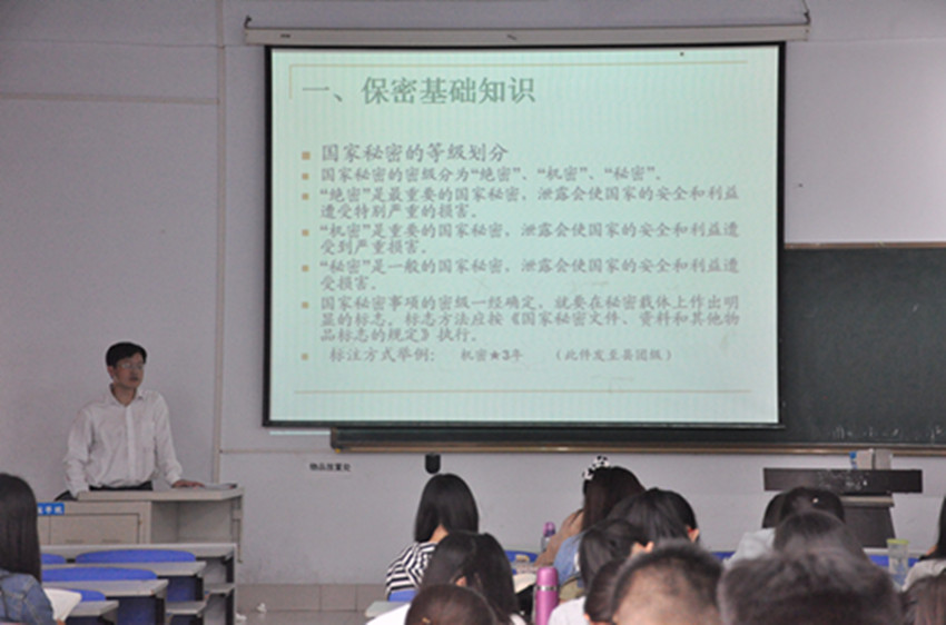 徐云飞主任详细讲解了保密工作的基本概念、当前保密工作的形式与任务以及相关法律法规,增强了同学们自觉维护国家安全的观念。随后,徐主任结合几例大学生泄露国家机密的案件,分析了泄密的基本内涵、泄密的基本方式、泄密的处罚规定以及预防泄密发生的各项措施,为同学们敲响维护本国情报安全的警钟。