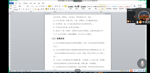 辅导员牛成亮首先向大家展示了2019年暑期社会实践的优秀成果,以此激励学生再创佳绩。会上牛老师向大家详细阐述了社会实践的含义、方式和意义等。他表示,社会实践可以帮助同学们做到知行合一,能够让同学们积累社会经验,达到“学校人”和“社会人”的统一。牛老师着重强调了社会实践安全及开展社会实践时要遵守当地的疫情防控的要求,做好个人防护。随后,牛老师带领大家熟悉了暑期社会实践安全指导手册。
