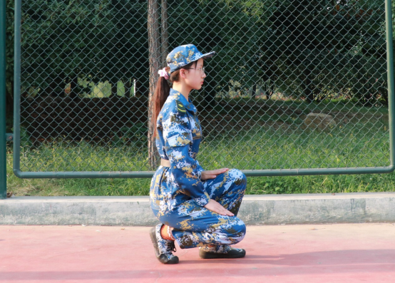 蹲姿,这是一个基本军训要领,撤腿,下蹲,起身,收腿,需自然得体大方,看似简单的步骤,但考验的是绝对的毅力和平衡力,考验的是一个合格军人的坚毅与不屈。我想这次军训生活会让我们稚嫩的心灵变得充盈成熟,让我们走出他人精心编织的暖巢,勇敢地站出来同风雨挑战,成就更好的人生。