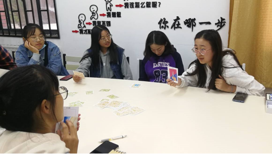 活动伊始,王桂清老师向大家讲解了游戏规则并作出了示范,该游戏首先是由玩家抽取OH卡,然后通过描述自己卡片上的画面的形式开展。玩家主要描述在卡片看到了什么,牌面中的人、物是什么,卡片内容跟你遇到的困惑有什么关系等。讲解结束后,同学们以六人为一个小组,积极踊跃地参与到游戏当中。