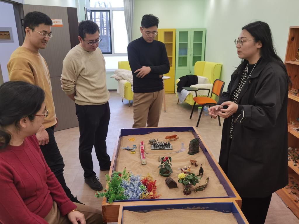 在参观过程中王桂清对学校心理功能室的设置进行了介绍,对心理咨询室、情绪宣泄室、沙盘模拟室、团体辅导室等场所的功能,进行了重点讲解。同时在讲解过程中,老师们体验了功能室的部分工具,对心理咨询和心理辅导有了更深入的了解。