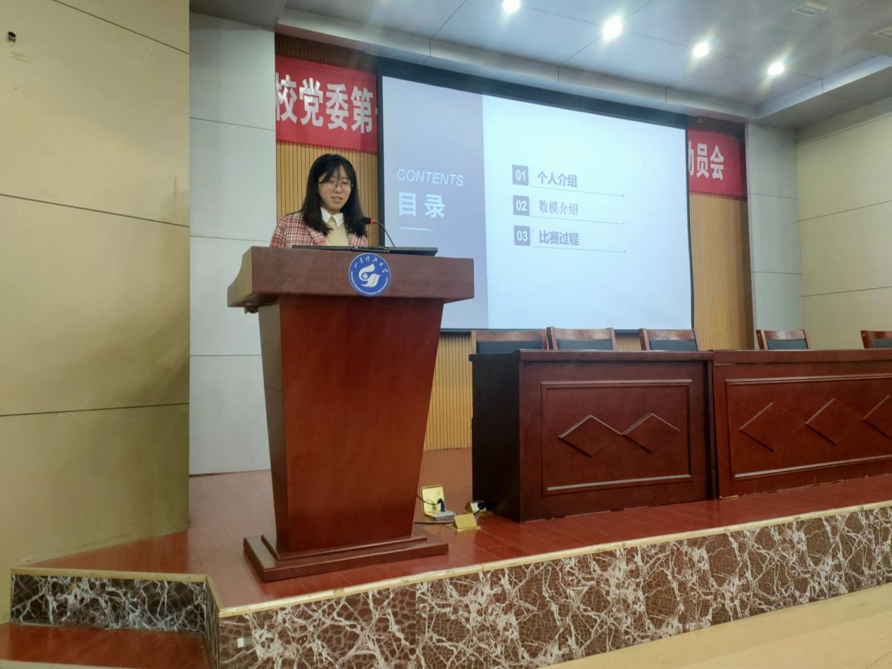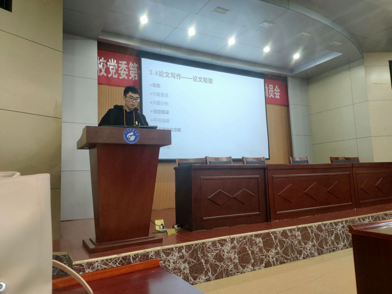在活动过程中,投资学18-1班张振江分别从组队技巧、建模的前期准备、建模数据查找及改正方面具体向同学们讲述了建模的过程,强调需要注意的事项,为同学们提供了许多实用的建议。物流管理18-1班柳雪雅重点讲述了建模论文的书写,并以自己的一篇参赛论文为例介绍了其中的基本内容,分享了建模过程中的趣事,鼓励同学们积极参与到比赛中。