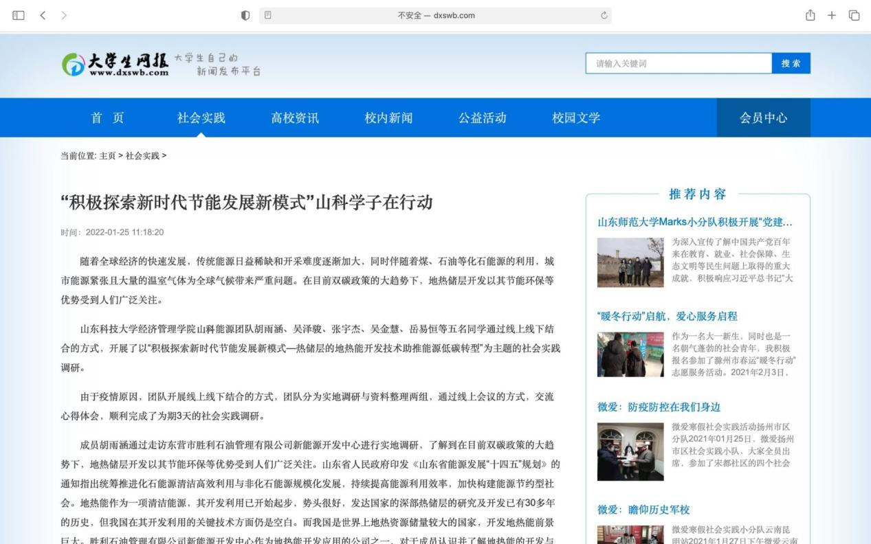 2022年1月19日至1月21日团队到山东省东营市胜利石油管理局新能源开发中心地热项目部进行了为期三天的社会实践调研。