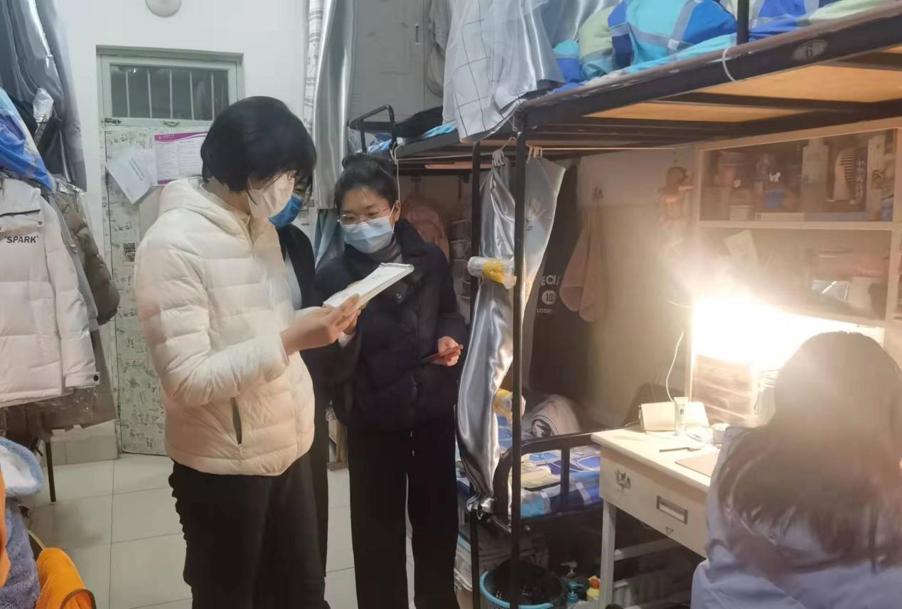 学院辅导员坚守一线,在核酸检测现场、学生宿舍总能看到他们的身影,他们仔细核对核酸检测名单,维持秩序,检查宿舍卫生、一日三检记录等,关心学生在宿舍的生活学习情况,解决宿舍矛盾,引导学生积极落实疫情防控举措。