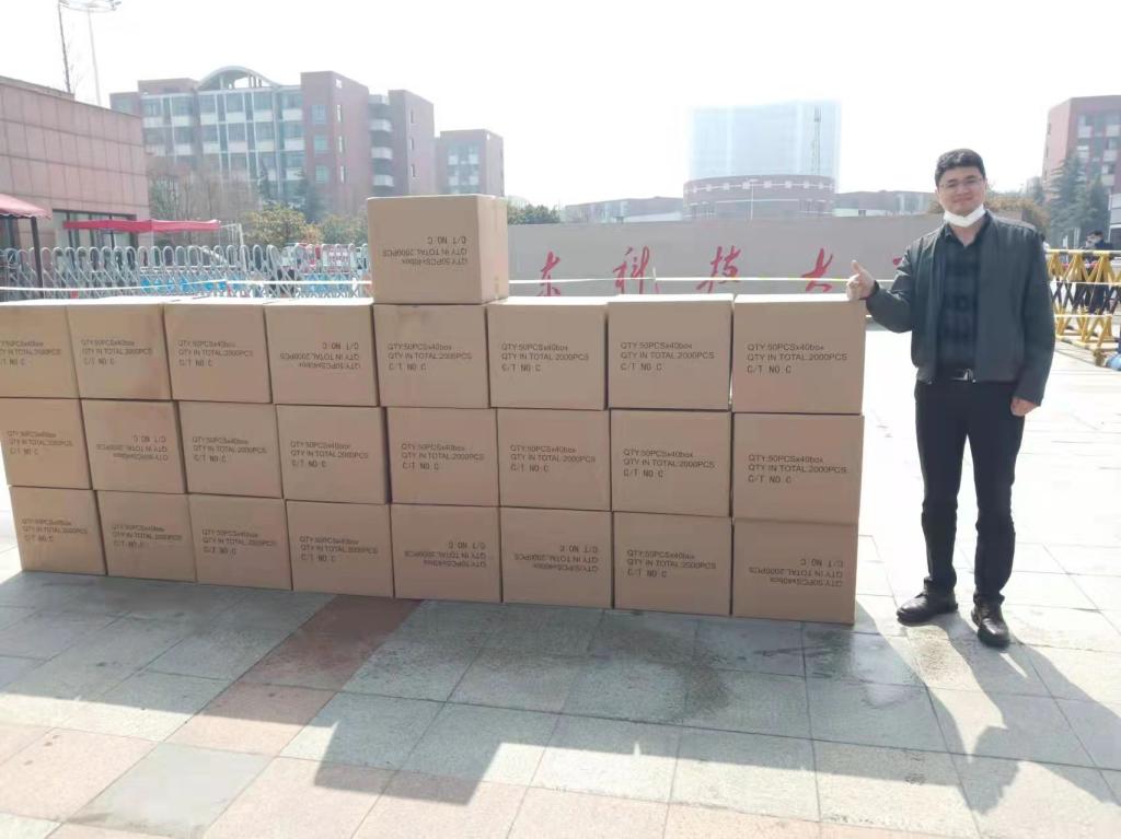 董效飞一直心系母校,关心学校发展。学校当前正在全力抗击新冠疫情,他及时联系学校,向学校捐赠了这批医用口罩。一箱箱口罩代表着他对母校师生的深深关爱,他以实际行动助力学校抗击疫情,共克时艰。