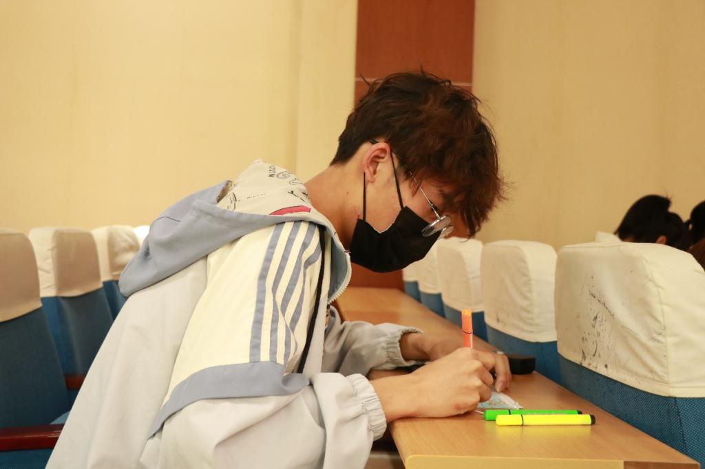 活动现场,院志愿服务部负责人吴翔飞首先介绍了活动内容,安排了活动任务;随后,志愿服务部干事引导同学们领取彩笔与口罩。同学们使用彩笔在口罩上绘画,并进行创意设计,小小的口罩,表达了同学们战胜疫情的决心和对疫情结束的期待。活动结束后,同学们带走自己设计的口罩,把抗疫、防疫的思想传播给更多的同学。