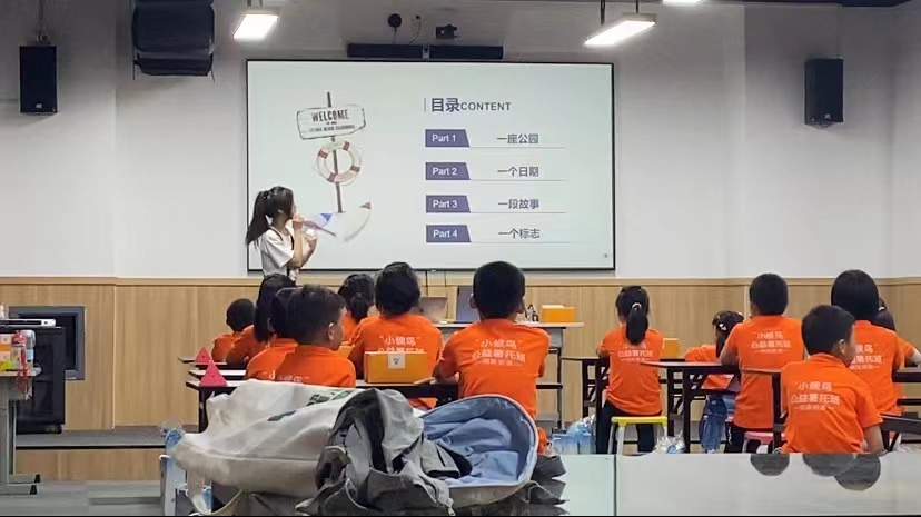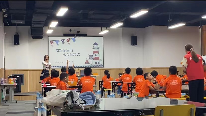 7月25日,在泰州市青少年活动中心,王禹为暑托班的孩子们讲授了泰州海军诞生地的相关红色历史,通过一座公园、一个日期、一段故事、一个标志为孩子们讲述了海军诞生的历史以及泰州与海军诞生相关的红色基因。