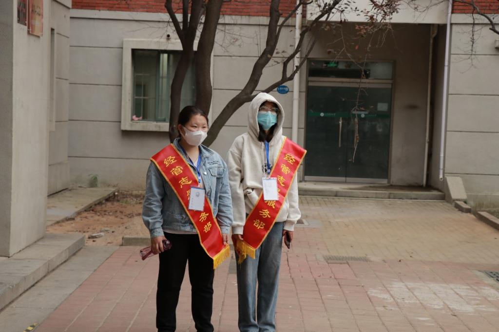 志愿者们在学院各个宿舍楼宇、办公楼附近开展疫情防控宣讲志愿活动,提醒过往的同学们“请戴好口罩,保持一米线,做好疫情防护。”