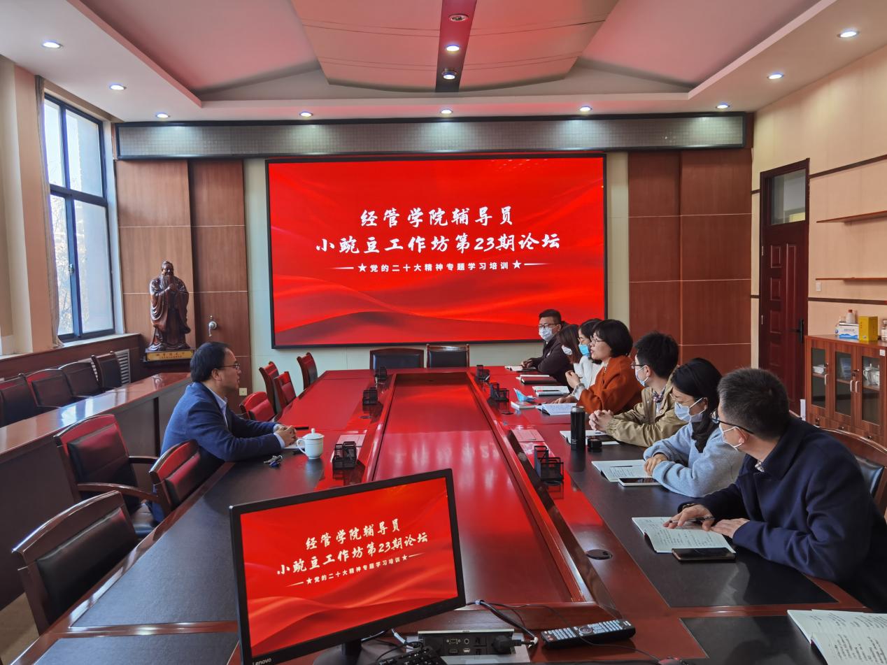 为深入学习宣传贯彻党的二十大精神,经管学院举办第二十三期辅导员小豌豆工作坊,开展党的二十大精神专题学习培训。培训会邀请山海泉宣讲团成员、马克思主义学院副院长邵勇担任主讲人,必赢776net党委副书记、副院长高一丹主持会议,学院全体辅导员参加。