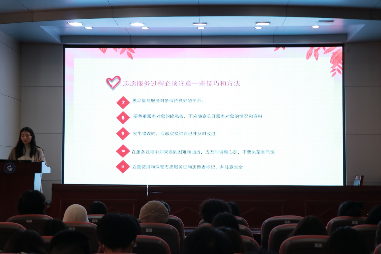 吴翔飞就“为什么要做志愿者”这一问题为同学们做了详细分析。针对志愿服务的定义、原则、意义和志愿服务精神的定义等问题与同学们进行探讨,引导同学们对志愿服务有一个较为全面的认识,激发大家对志愿服务的热情,激励同学们投身到志愿服务工作当中去。