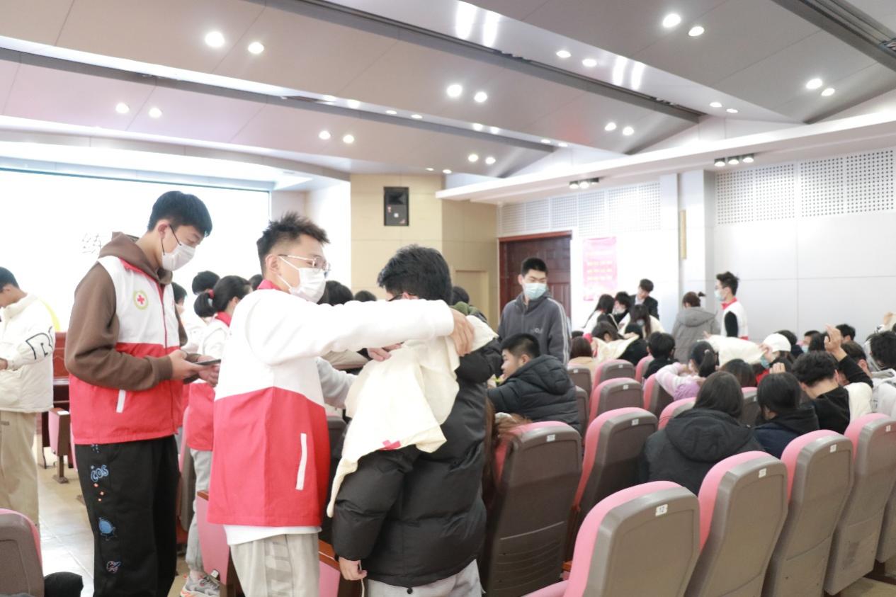 活动中,志愿者们现场向同学们详细演示了各类紧急包扎的措施。在讲解后,鼓励同学们组队进行自我实践,从而更好地掌握紧急救护的操作方式。宣讲会上,志愿者们通过视频与讲解相结合的方式向同学们传授应对各类突发情况紧急避险的知识,让同学们更深入地了解和掌握相关急救和预防措施。