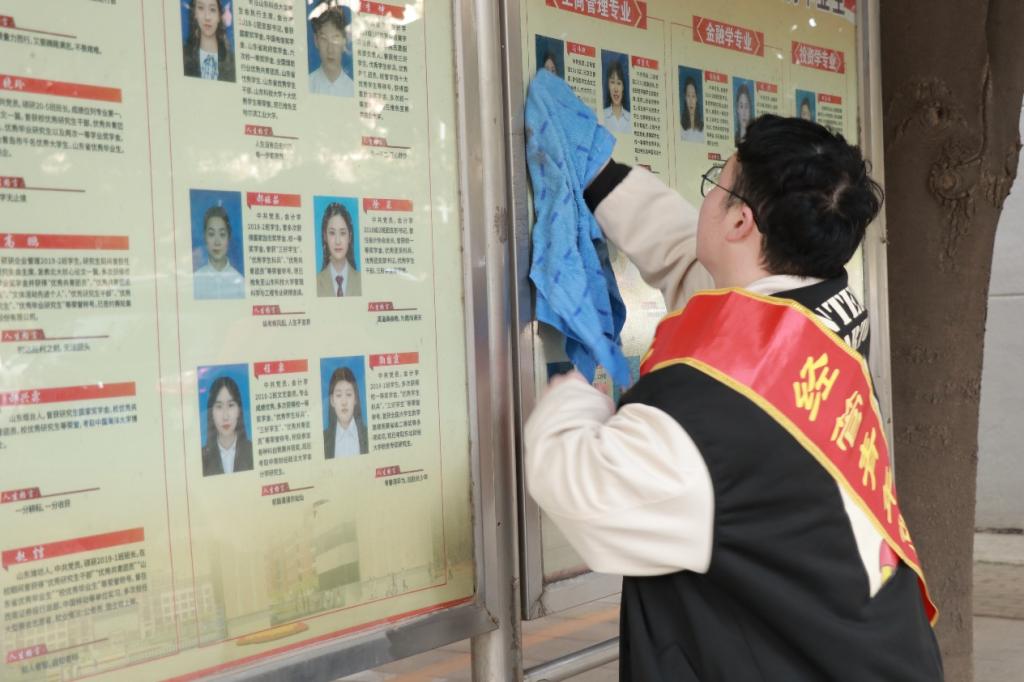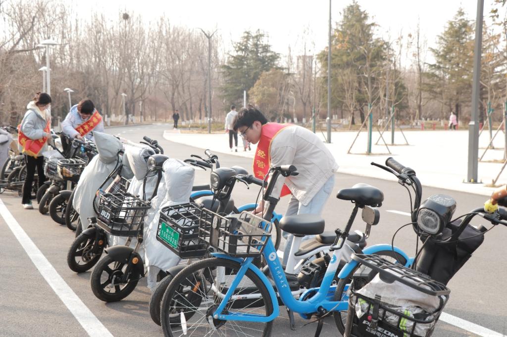 志愿者们分组负责摆放自行车、擦拭展览窗和清洁教学楼栏杆。志愿者们认真负责,高质量完成工作任务。活动最后,志愿者们齐聚学院文化长廊一起观看了关于雷锋同志的故事,在被深深感动的同时,也切实地体会到了劳动带来的快乐。