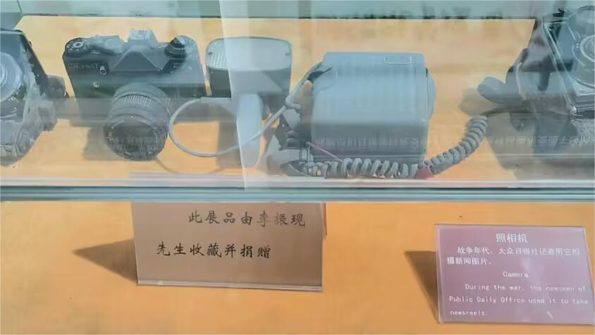 展厅中陈列着当时印报用过的石印板、照相机、铅字、四开印报架、油沙盘、文件等实物,以及用板面绘制的《大众日报》创刊经过和办报史。战争年代的照相机格外耀眼,工作人员介绍,此展品是当时记者们工作必不可少的工具,记录了众多历史事件,其收藏与保存有着重要意义。