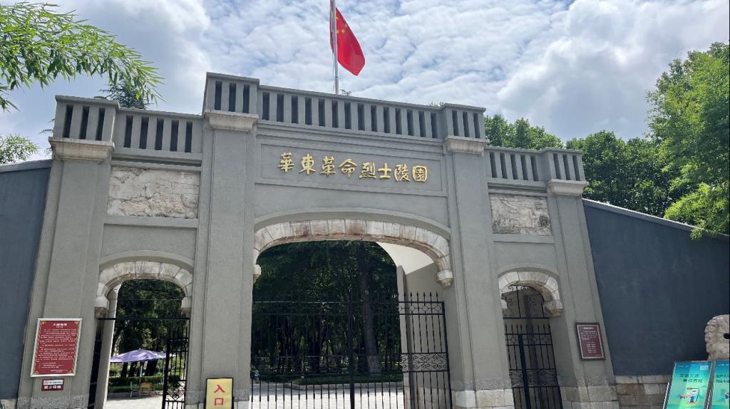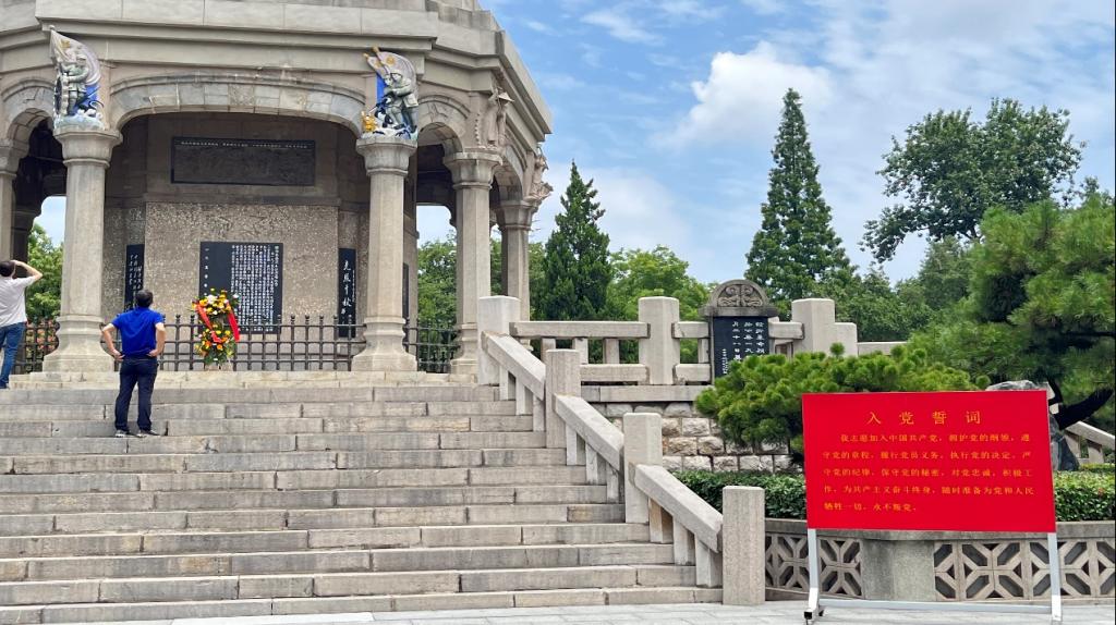 接着,小分队继续深入历史,追忆缅怀过去的故事。实践小分队的成员来到了座落在山东省临沂市兰山区的华东革命烈士陵园。陵园为缅怀抗日战争和解放战争时期牺牲的华东军民而建。小队成员参观了位于陵园中心的纪念碑,纪念碑旁竖立着的入党誓词为陵园更增添了一分庄严,这是荣誉,更是责任。小分队在公墓前静默追思。脚步继续向前,馆内的每一处塔、堂、馆、亭都的建筑设计蕴含着追忆的深意。