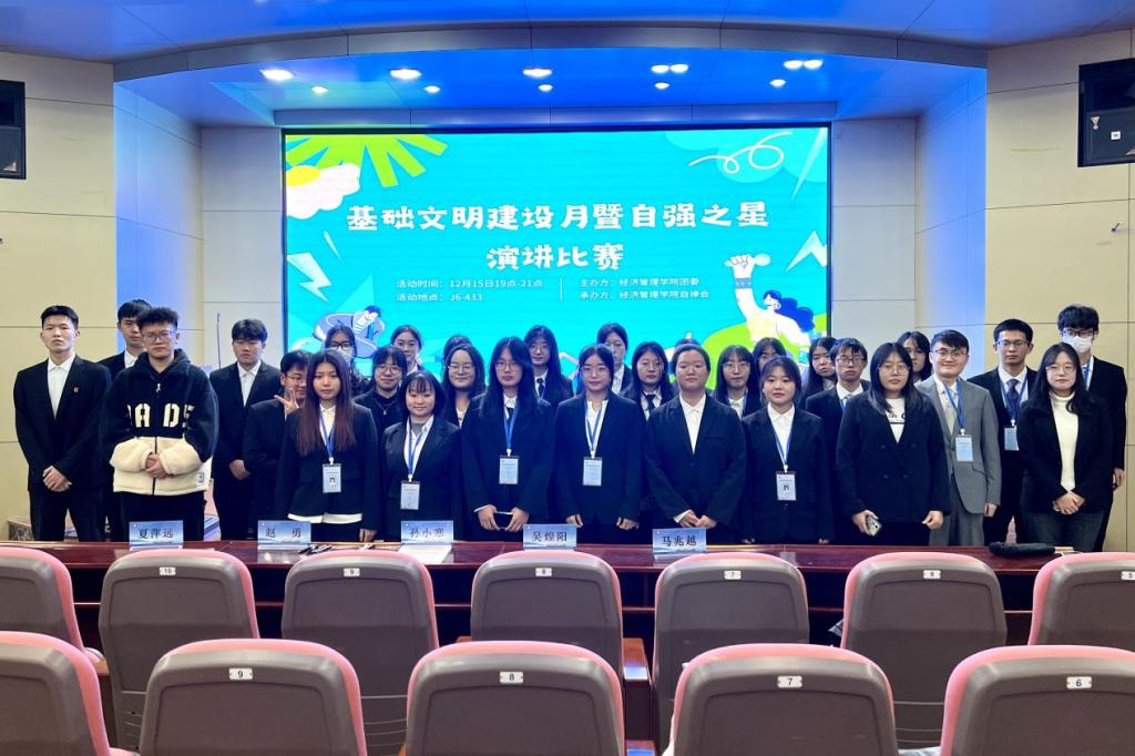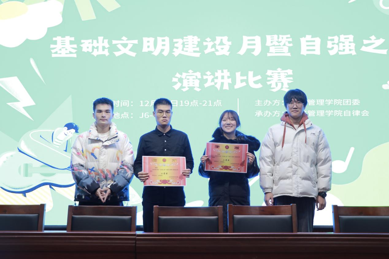 12月15日,必赢776net于学院楼四楼报告厅举办了基础文明建设月开幕式暨自强之星演讲比赛。此次活动以倡导文明为核心,弘扬自强不息的精神,促进文明校园的建设。本次活动的评委有必赢776net自律会分管老师孙小寒,学生会负责人夏萍远、吴煌阳、赵勇、马兆越。