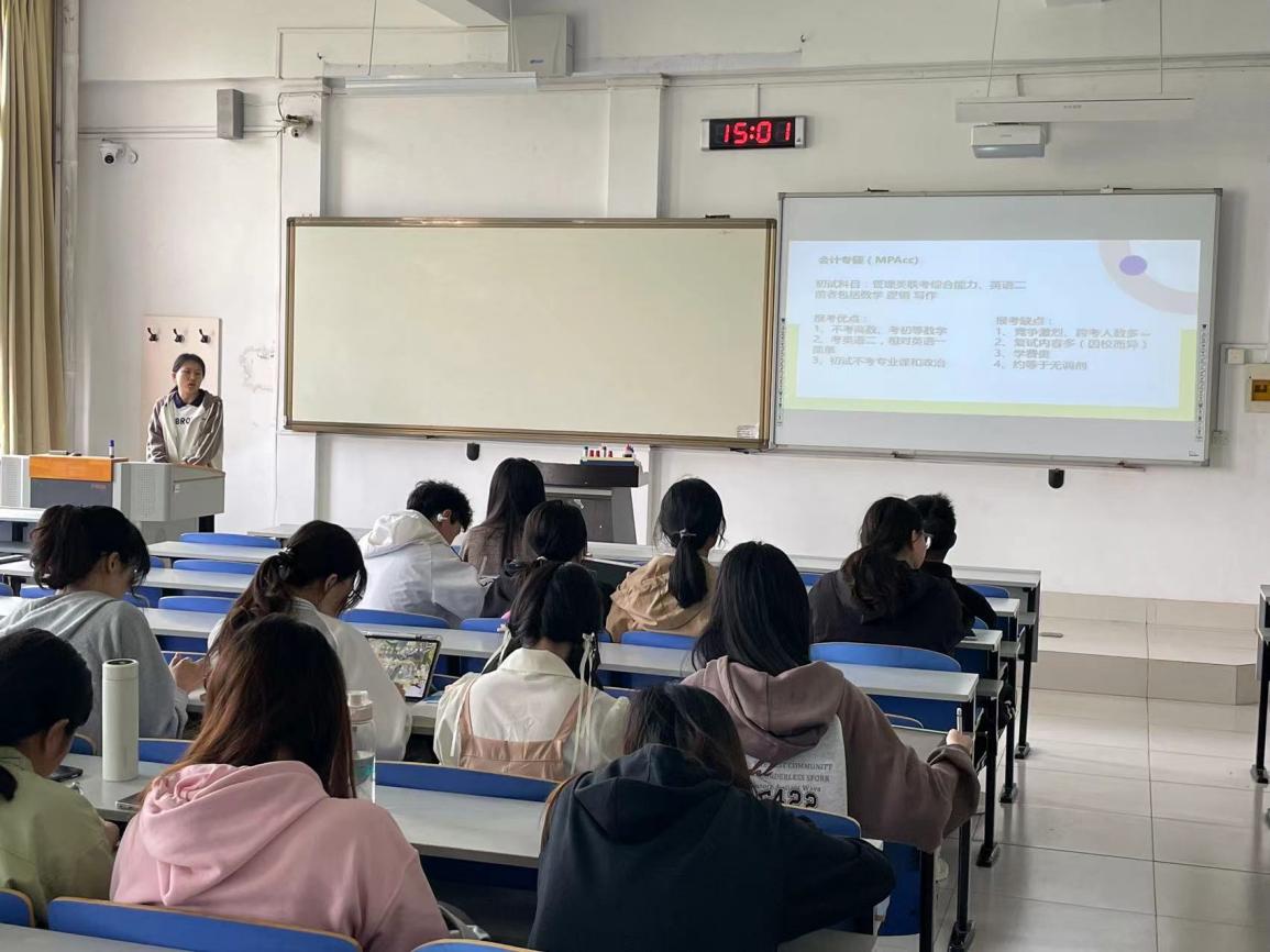 为帮助2021级同学做好考研准备,5月7日,必赢776net于J14教学楼举办考研经验分享会,会计学2020级学生唐欣雨、袭雪怡受邀主讲,会计学2021级考研同学参会。