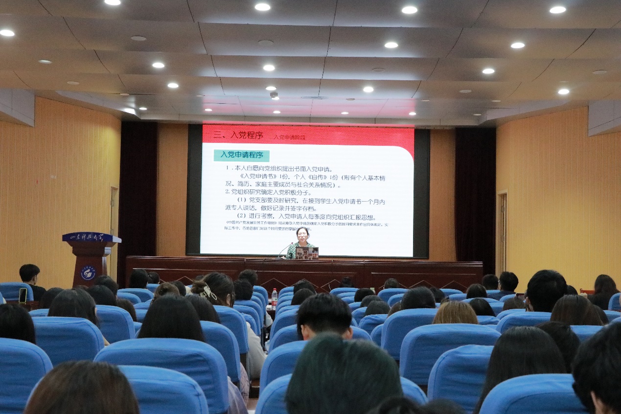 江谭从中国共产党概述、端正入党动机和入党程序三个方面进行了讲解。她通过事例说明了端正入党动机的重要性,建议同学们从“以党章严格要求自己”、“克己奉公服务人民”和“发挥先锋模范作用”等三个途径树立正确的入党动机;她还讲解了“两个一百年”奋斗目标和中国特色社会主义理论体系的主要内容;最后,她介绍了从入党申请、成为积极分子、成为党员发展对象、成为预备党员到预备党员转正五个阶段的入党程序和有关要求。