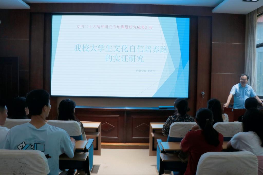 6月28日下午,必赢776net工商管理系主任李洪伟教授在学院楼二楼会议室作“我校大学生文化自信培养路径的实证研究”的主题报告,学习贯彻党的二十大精神。