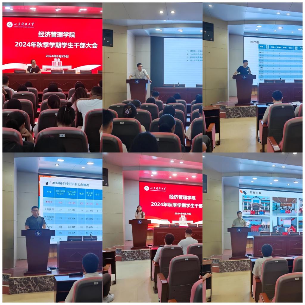 会上,学院团委书记曲长胜介绍了学院2024年大学生科技创新成果获奖情况,对上学期的各项科创比赛进行详细分析,对本学期的科创比赛工作提出要求,希望同学们能够积极参加科创比赛,提升自身能力。辅导员孙小寒介绍了公寓建设情况,对全部年级上学期的宿舍卫生情况进行了总结分析,对下学期的宿舍工作做了安排。辅导员王鹏民介绍了2024届毕业生就业工作情况,分析了学院就业、考研、保研等数据,要求学生干部协助辅导员老师做好数据摸排,了解同学就业动向,推送招聘信息。优选计划辅导员薛传旭介绍了2024年暑期社会实践情况,对本次社会实践的组织、实施及结果进行总结,对优点及不足进行分析,希望同学们积极参加各类社会实践活动。辅导员李含聪介绍了大学生心理方面相关知识,分析了需要特别关注群体的各项特征,要求学生干部们定期到学生宿舍,与学生们进行沟通交流,以便更好了解学生们的情况,并及时向辅导员反馈。