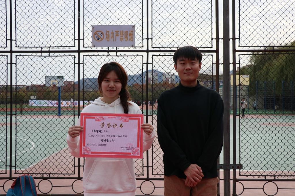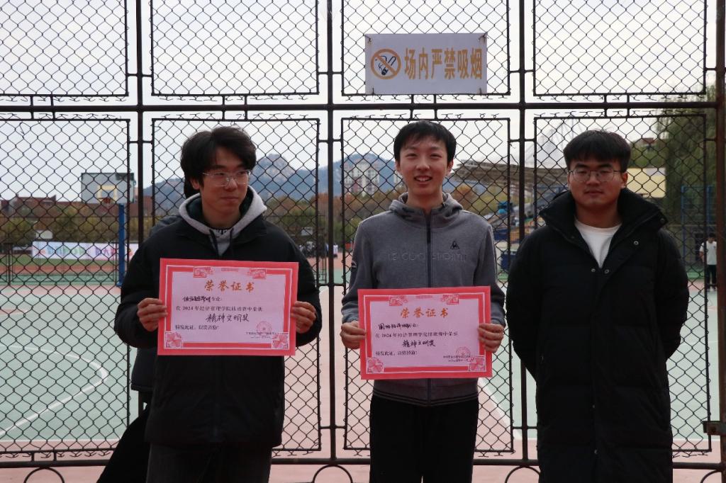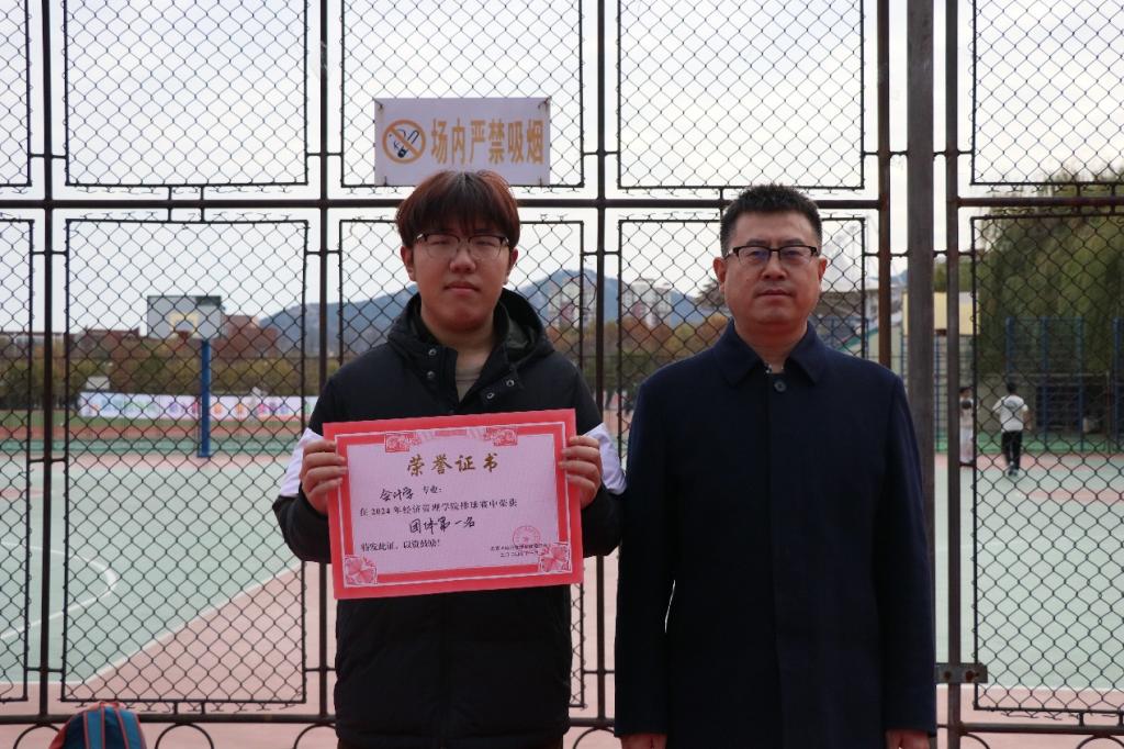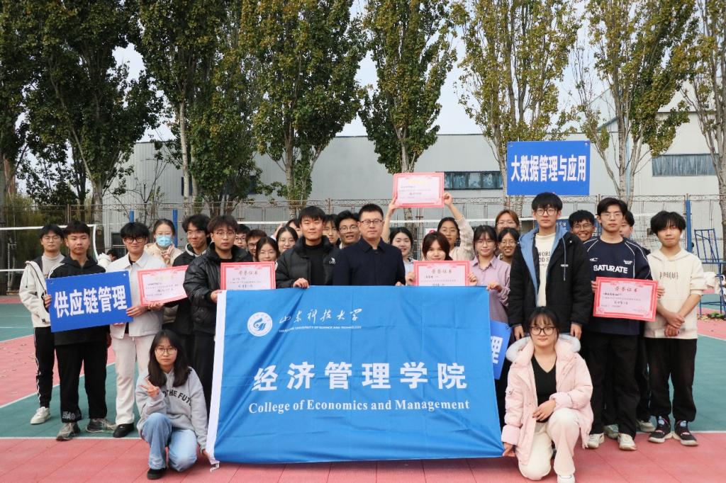 决赛采用积分制,定夺胜负。各专业参赛选手协作默契,聚精会神,发球精准、接球稳健、扣杀有力、拦网果断,赢得了场边观众的阵阵掌声与欢呼。最终,经过激烈角逐,会计学专业排球队表现出色,凭借成熟的球场战术和完美的团队配合,成功斩获一等奖,工商管理专业、大数据管理与应用专业分别荣获二等奖、三等奖,国际经济与贸易和供应链管理专业荣获精神文明奖。学院团委书记、学工办主任曲长胜,2024级辅导员于鹏伟,学生会邢尚垒为其颁奖。